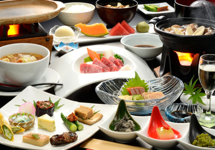地元の山の幸を中心に、きめが細かく適度な霜降りの「山形牛」、米どころ山形が誇るお米「つや姫」などこだわりの食材をふんだんに使ったお食事を、夜は会席料理、朝はバイキングでご提供しています。特に夜の会席料理では、季節によりお料理の内容を変え、山形の「旬」を心ゆくまでお楽しみいただいています。