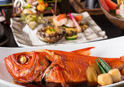 当館は「旅館の客室はお客様がゆっくり寛ぐための場所」と位置付け、お部屋でのお食事提供はせず、朝食・夕食ともにお食事処で召し上がっていただくスタイルです。お食事処では、海の幸・山の幸ともに豊富な伊豆半島の恵みをふんだんに使った四季折々のお料理をご提供。和のテイストを基調としつつ、素材の新鮮さと持ち味を最大限に引き出すため、ジャンルを超越した様々な創作料理をお届けしています。